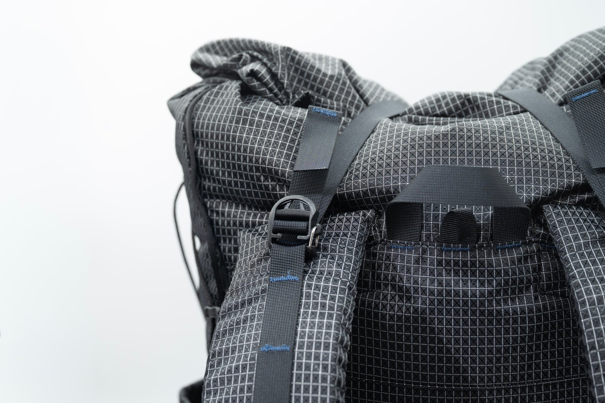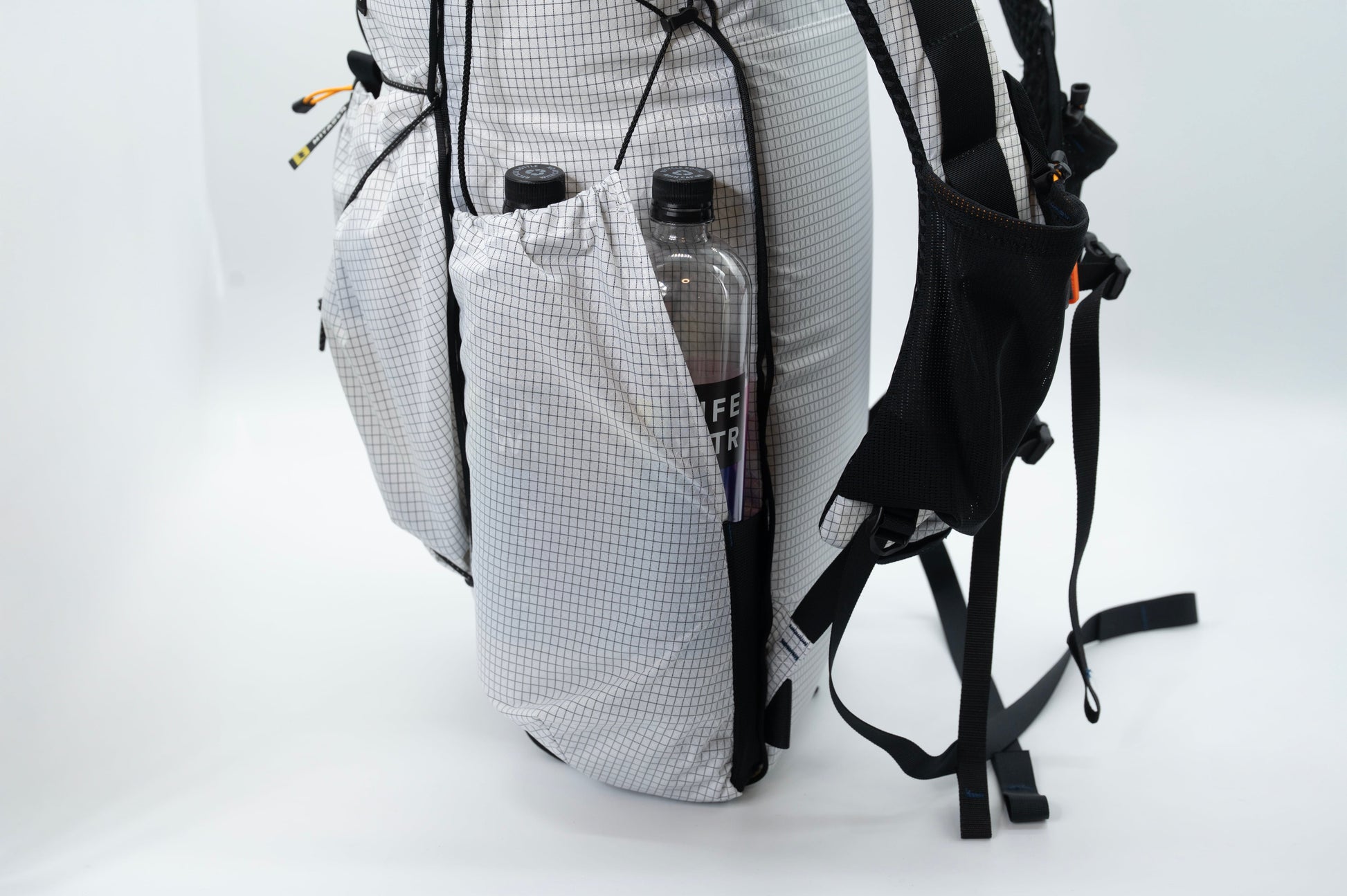 ・全体設計:フレームレスで成立させる構造 CREST 30はフレームを持たないシンプルな筒状構造です。フレームレスにすることで軽量化と構造のシンプルさを両立しつつ、パッキングスキルがあるハイカーが自分の荷物の重心を自由にコントロールできる設計にしています。背面の取り外し式インナーパッドがその役割を担い、状況に応じてスリーピングパッドをパッド代わりに使うことも想定しています。 ・3D CAD立体裁断 CREST 40と同様に、全てのパターンを3D CADで人体から設計した立体裁断です。フラットなパターンではなく、背負った状態で背面カーブが身体に沿うよう設計されており、丸一日の山行後にズレや当たりが出にくい形状を追求しています。 ・全周デイジーチェーン CREST 30の全周にわたって均等間隔でデイジーチェーンを配置しています。スリーピングパッドの外付け、テントポールの固定、アクセサリーの取り付けに対応。メーカー側が使い方を決めるのではなく、ハイカーが現場で最適解を作れる余白を残した設計です。 ・サイドポケット 2Lペットボトルが入る大型サイドポケットを左右に装備。ロングトレイルでは補給ポイントまでの水を持ち歩く必要があり、行動中に立ったまま取り出せる位置と開口形状にしています。 ・素材の使い分け 箇所ごとにナイロン・ポリエステル・高強力ポリエチレンを使い分け、ダメージが集中しやすい部位(底面・ストラップ結合部・サイドポケット口)を重点的に強化しています。全体を均一に厚くするのではなく、「必要な場所が強い」設計です。 ・量産と再現性 愛知県岡崎市の自社工房でレーザー裁断機を用い、個体差が出にくい裁断と縫製品質を確保しています。UL設計でありながら道具として安定した品質を維持することを重視しています。