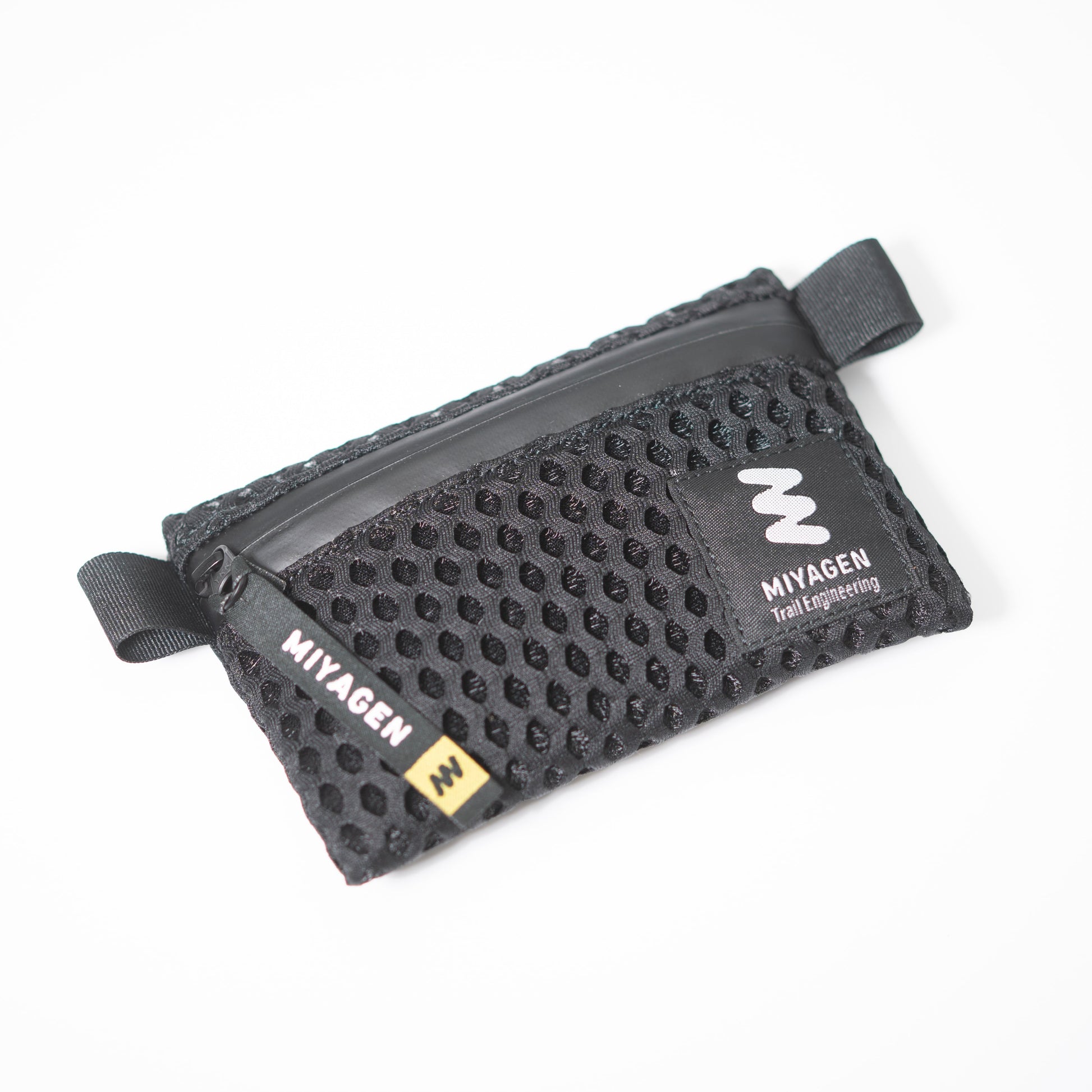 ■デザイン 内部は仕切りもなくシンプルなポーチとなります。 見た目がいいので止水ファスナーを使用しています。 左右にはループを設けており、お好みでストラップやリーシュをつけていただけます。 スライダーの持ち手には「MIYAGEN」のロゴ入りのリボン式の持ち手があります。 ダブルラッセルメッシュなので通気性があります。そのため水が侵入しやすいのでお気をつけてください。
