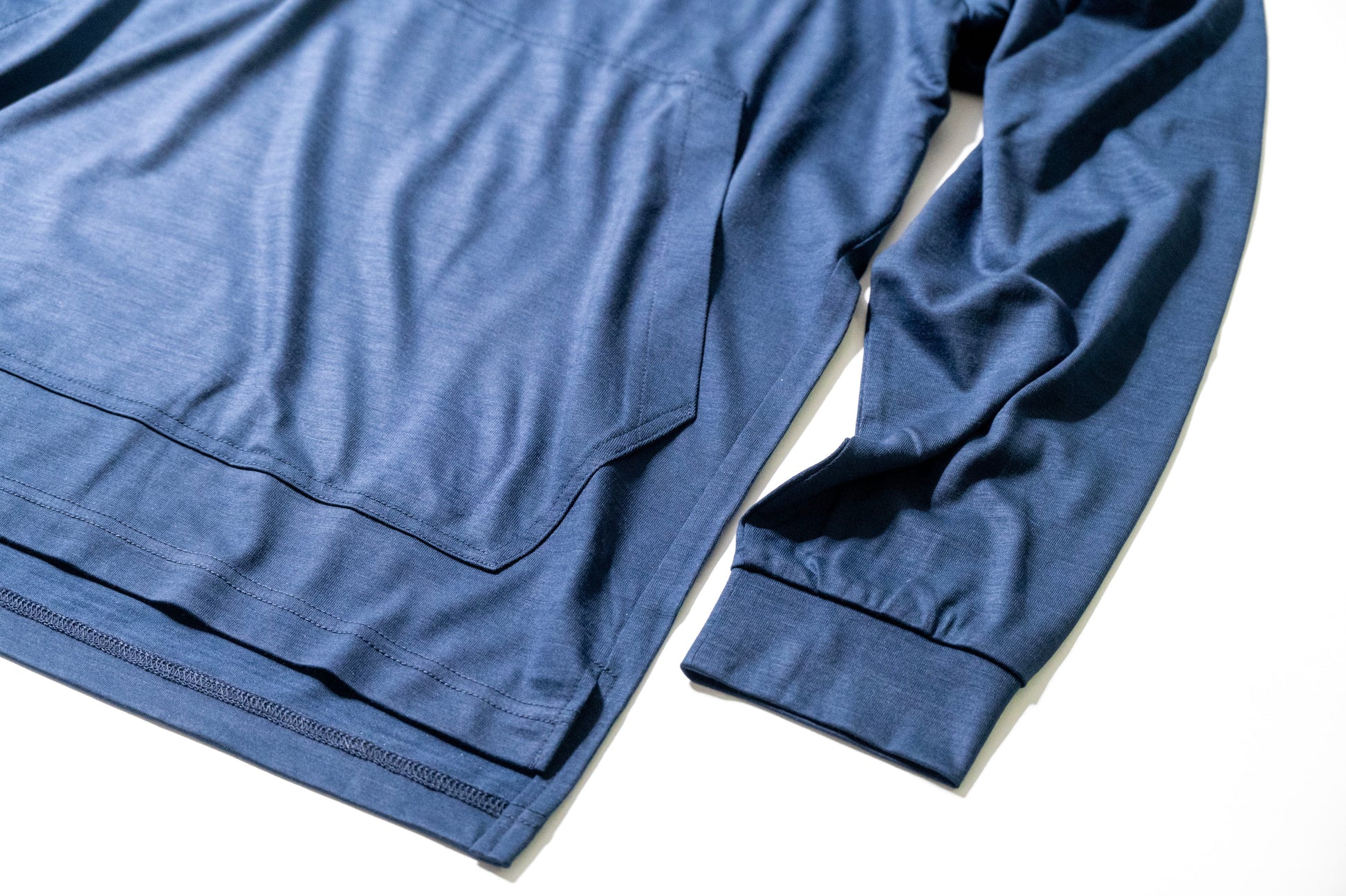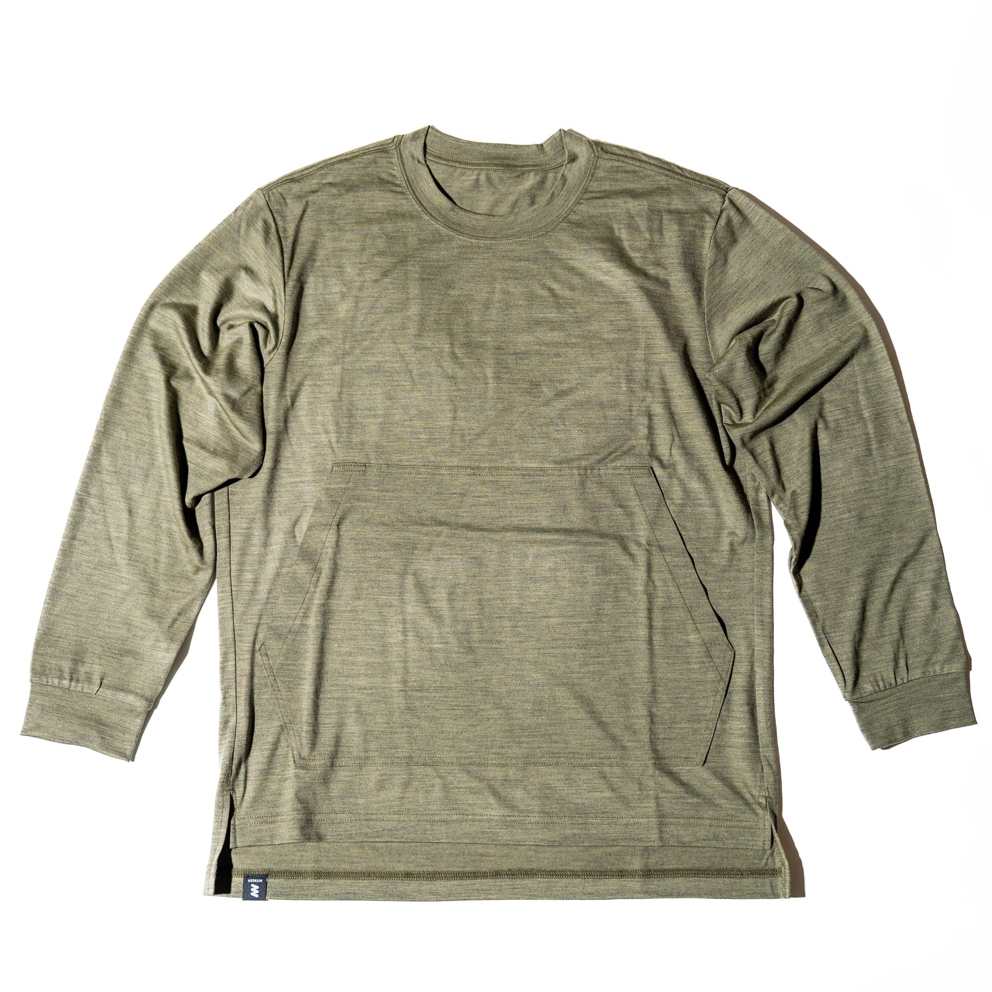 ロングトレイルのためのデザイン ずっと使いやすいデザイン このロングスリーブ メリノ フーディの1番目の特徴は立体裁断のフードと大きなカンガルーポケットです。 ロングトレイルでは長期間に渡り直射日光の降り注ぐフィールドを歩きます。頭部の日焼けを防ぐ為にフーディを採用しました。ウールによる吸湿性能と遮光性能が優れているためフードをつけていても涼しく、強い日差しから皮膚を守ることができます。 夏は涼しく、冬は暖かく、あらゆるフィールドで季節を問わず使用可能です。 - メインボディ フィールドでは体を動きやすくするため少しだけオーバーサイズにしております。ハイキングはもちろん、日常にも着ていただけるパターンにこだわりました。 シンプル縫製で糸の数を減らし極力突っ張り感を軽減するようにしています。 シンプルなパターンでありながらも立体裁断にしているパターンとなっており、後身頃は大きく、前身頃を小さくしています。さらに背面はかがんだり、しゃがんでも捲れ上がらないように背面を長く設定しました。 さらに腕にはリブが備わっており腕捲りで腕に止めやすい構造にしました。 - カンガルーポケット 古くから手の冷えを防ぐために「カンガルーポケット」は使われており、別名「マフポケット」「ハンドウォーマーポケット」とも呼ばれます。 さらにポケットの位置も重要です。身体の中で温度の高い腹部となっており、手を温めるために最適な場所ということになります。 カンガルーポケットへ手ぬぐいを入れたり、カイロを入れたりしてお腹を温めることも可能です。さらに、体温を利用してcold meal(ガスを使わないハイキング料理)を作ることもできます。 離れている水場までポケットにペットボトルを入れたり、ペットボトルで体を冷やしたり…使い方は自由です。 ポケット部分を別の生地にしてコストを削減したりもしますが、温めることを優先し全てのパーツがウールであることにこだわりました。