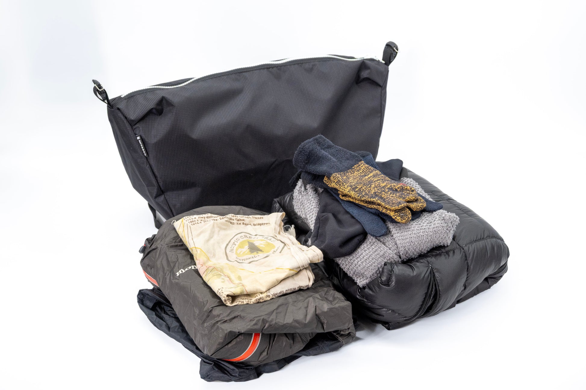 ■収納 10Lというスタッフバッグとしては大型サイズ。サブバッグにもなるスタッフバッグとなります。 1mの短めのストラップが付属しているため肩掛けとしても利用可能です。 内部には仕切りがあり、ストラップの収納も可能です。 仕切りにはベルクロがあり、内部で荷物が暴れない様になっています。ベルクロは服を傷つけない特殊な材質を使用しています。 10Lというサイズは1週間分の食料を入れるのにもちょうどいいサイズ感です。 ・1週間分の食料の収納 ・防寒着とレインウエアと着替えの収納 ・サブバッグとして バックパックの横幅、奥行きに隙間なく入れられるサイズを目指しました。 MIYAGENのCREST40だけではなく、様々なメーカーへも使えるサイズ感です。 トップリッドとして CREST40にトップリッドとしても装着可能です。 両方のスタビライザーのベースのループにフックを差し込んで固定ができます。 ベルトループも設けているため横ずれのしにくい構造になっています。