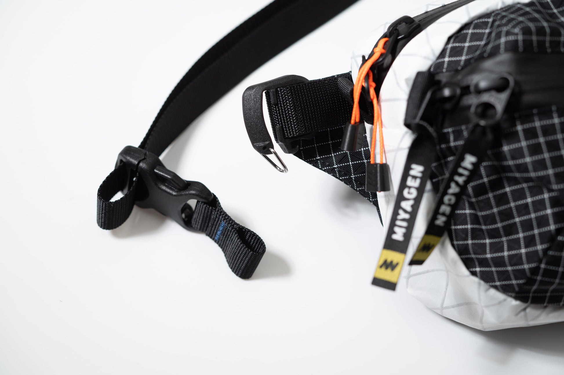 ■メインボディ まずファスナーを開くときの角度にこだわりました。 お腹に巻き付けた時にファスナーが垂直に見える角度に設定し、ファスナーがスムーズに動く角度にしております。両端面までファスナーを伸ばしているため開口部は大きく確保されます。 ファスナーのジッパープルは3Dプリンターで一つずつ制作しております。 内部の体側に地図を入れる仕切りがあります。地図を入れない場合は手ぬぐいなどを入れてクッションにしてもいいかと思います。 メインボディの厚みはRICOH GR3などのコンパクトカメラや小型交換レンズなどが入れられる大きさになっています。 内部の生地には100DのイエローのROBICナイロンを使用しているため、イエローカラーに照らされ視認性を高めております。 ■フロントポケット 小物や鍵などを入れるポケットとして設計しております。フロントポケットには高さのあるマチをつけているため、メインボディが満杯になってもフロントポケットが潰れない設計になっています。 内部にはキーストラップがあり、鍵を留めておくことができます。 鍵、二つ折り財布、イヤホンなどを入れられる厚みに設計しています。 ■背面 バックパックの背面と同じく、通気性とクッション性のあるダブルラッセルメッシュを採用しています。上部からスマートフォンを入れられるポケットがあります。 さらに左右からはベルトの通し穴も設けており、お好みのバックパックのストラップやベルトを通すことが可能です。 ■フックとベルト 左右には着脱のできるワイヤーゲート式のバックルがあります。このバックルでベルトを簡単に着脱することができます。さらにワイヤーゲート式のバックルでバックパックなど様々なところへ装備することが可能です。 バックパック等のウエストへも追加パーツを使うことで装着が可能となります。