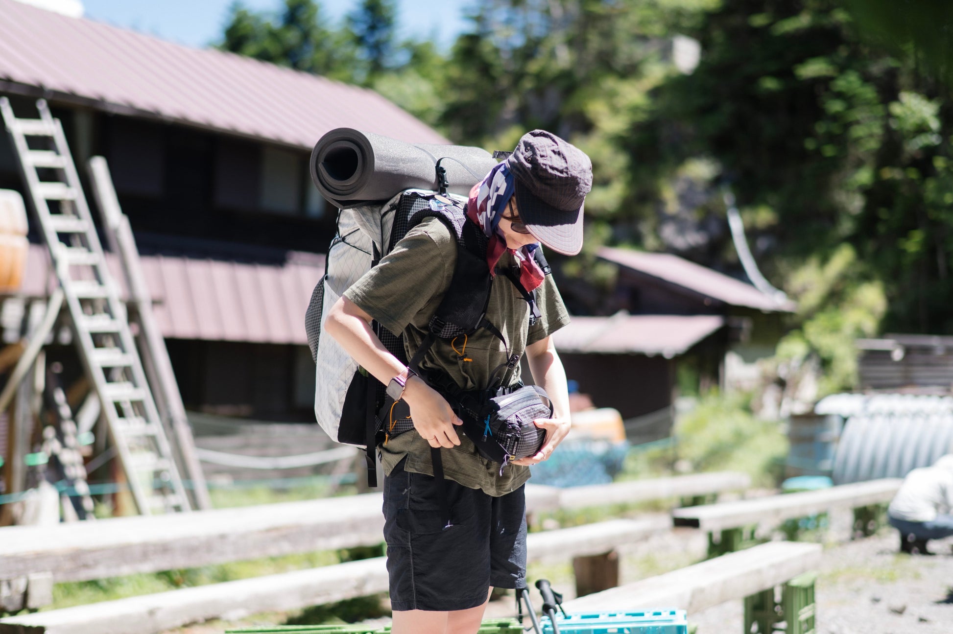 ロングトレイルのためのデザイン ずっと使いやすいデザイン - メインボディ フィールドでは体を動きやすくするため少しだけオーバーサイズにしております。ハイキングはもちろん、日常にも着ていただけるパターンにこだわりました。 シンプル縫製で糸の数を減らし極力突っ張り感を軽減するようにしています。 シンプルなパターンでありながらも立体裁断にしているパターンとなっており、後身頃は大きく、前身頃を小さくしています。さらに背面はかがんだり、しゃがんでも捲れ上がらないように背面を長く設定しました。 下記写真はロングスリーブのモデルです。 - カンガルーポケット 古くから手の冷えを防ぐために「カンガルーポケット」は使われており、別名「マフポケット」「ハンドウォーマーポケット」とも呼ばれます。 さらにポケットの位置も重要です。身体の中で温度の高い腹部となっており、手を温めるために最適な場所ということになります。 カンガルーポケットへ手ぬぐいを入れたり、カイロを入れたりしてお腹を温めることも可能です。さらに、体温を利用してcold meal(ガスを使わないハイキング料理)を作ることもできます。 離れている水場までポケットにペットボトルを入れたり、ペットボトルで体を冷やしたり…使い方は自由です。 ポケット部分を別の生地にしてコストを削減したりもしますが、温めることを優先し全てのパーツがウールであることにこだわりました。