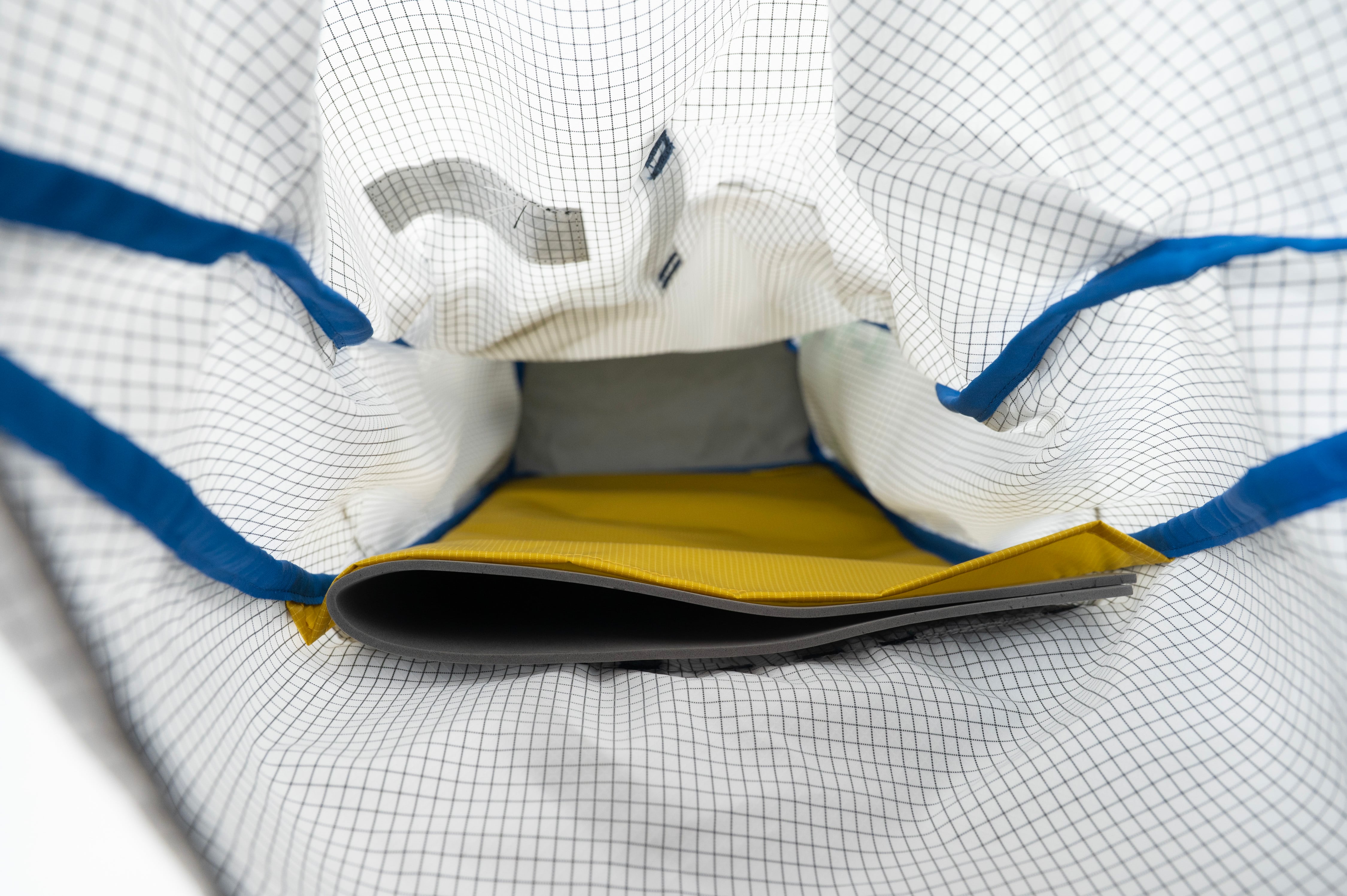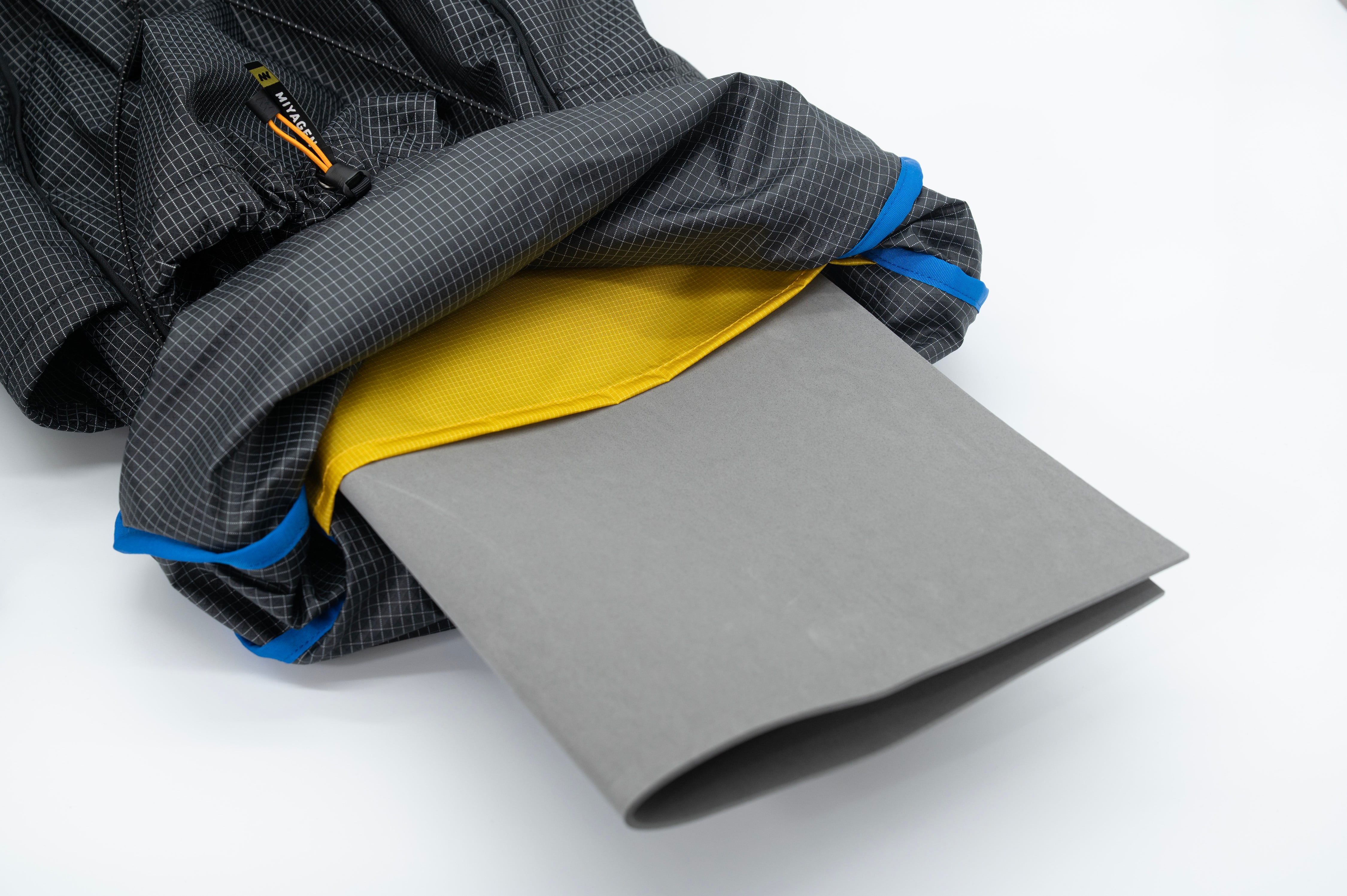 背面にはパッドスリーブがあり、2枚折りの独立気泡PEフォームを入れております。展開すると約50×50cmの大きさとなり、ビバーク時やテント泊での使用が可能です。
