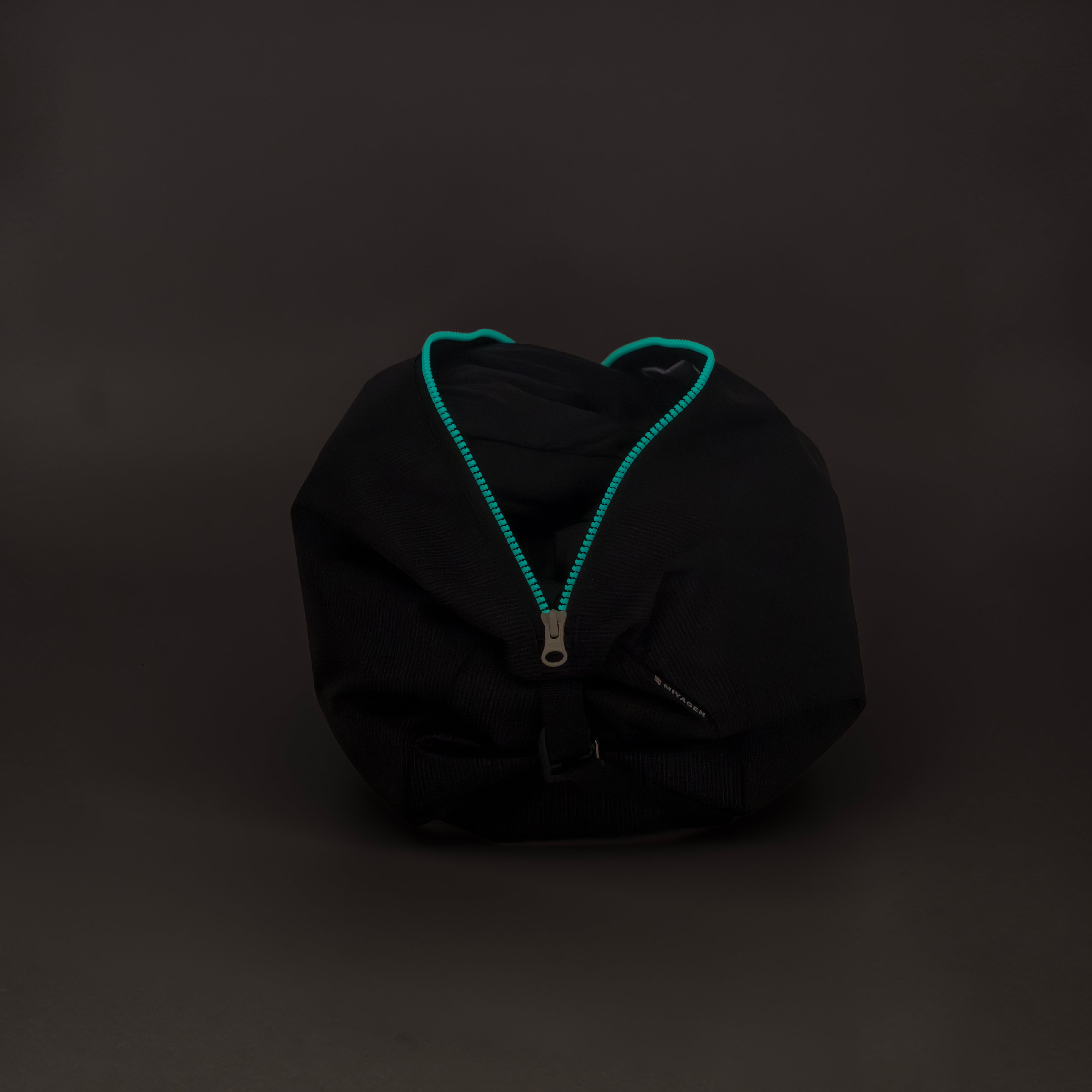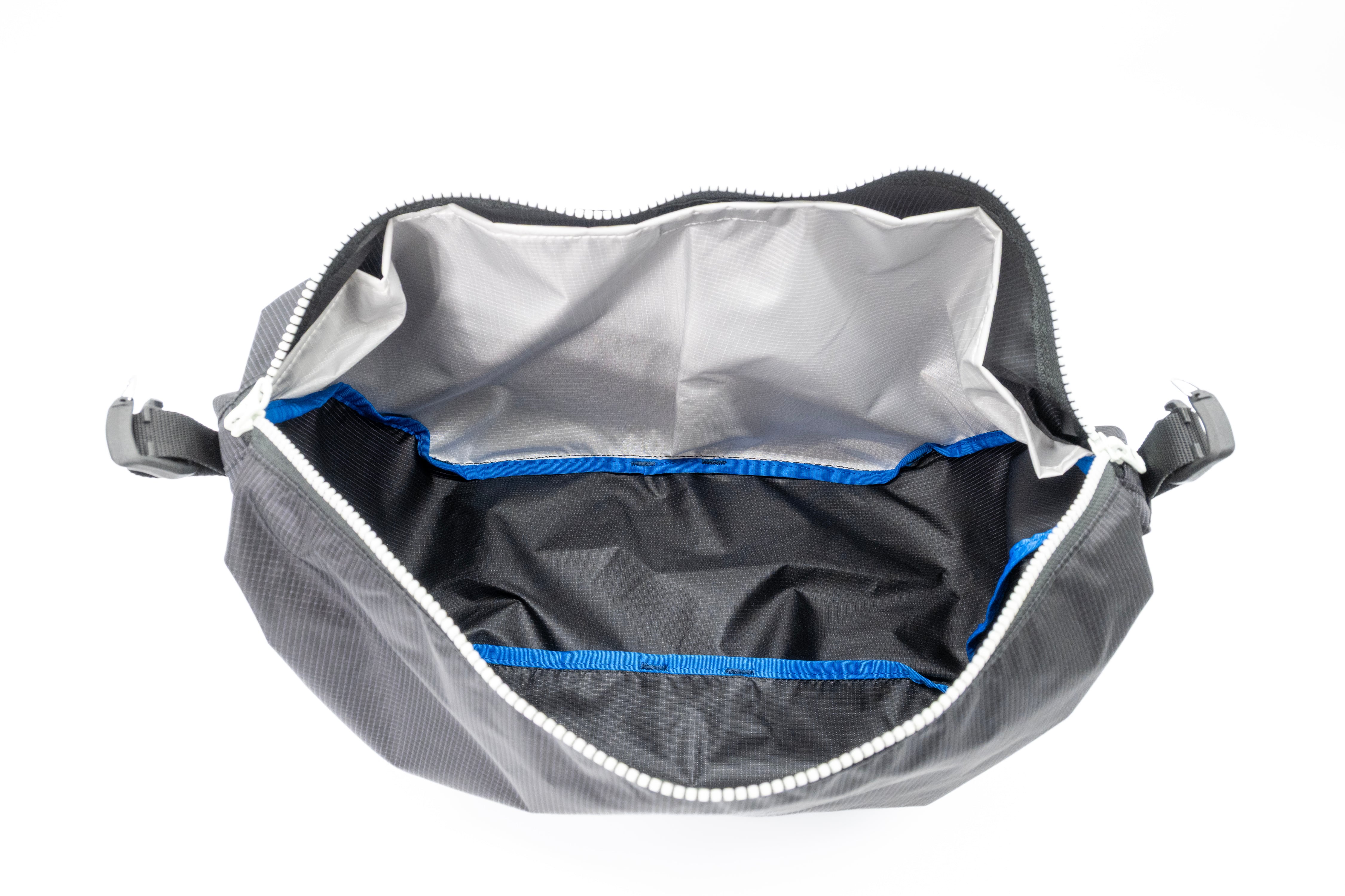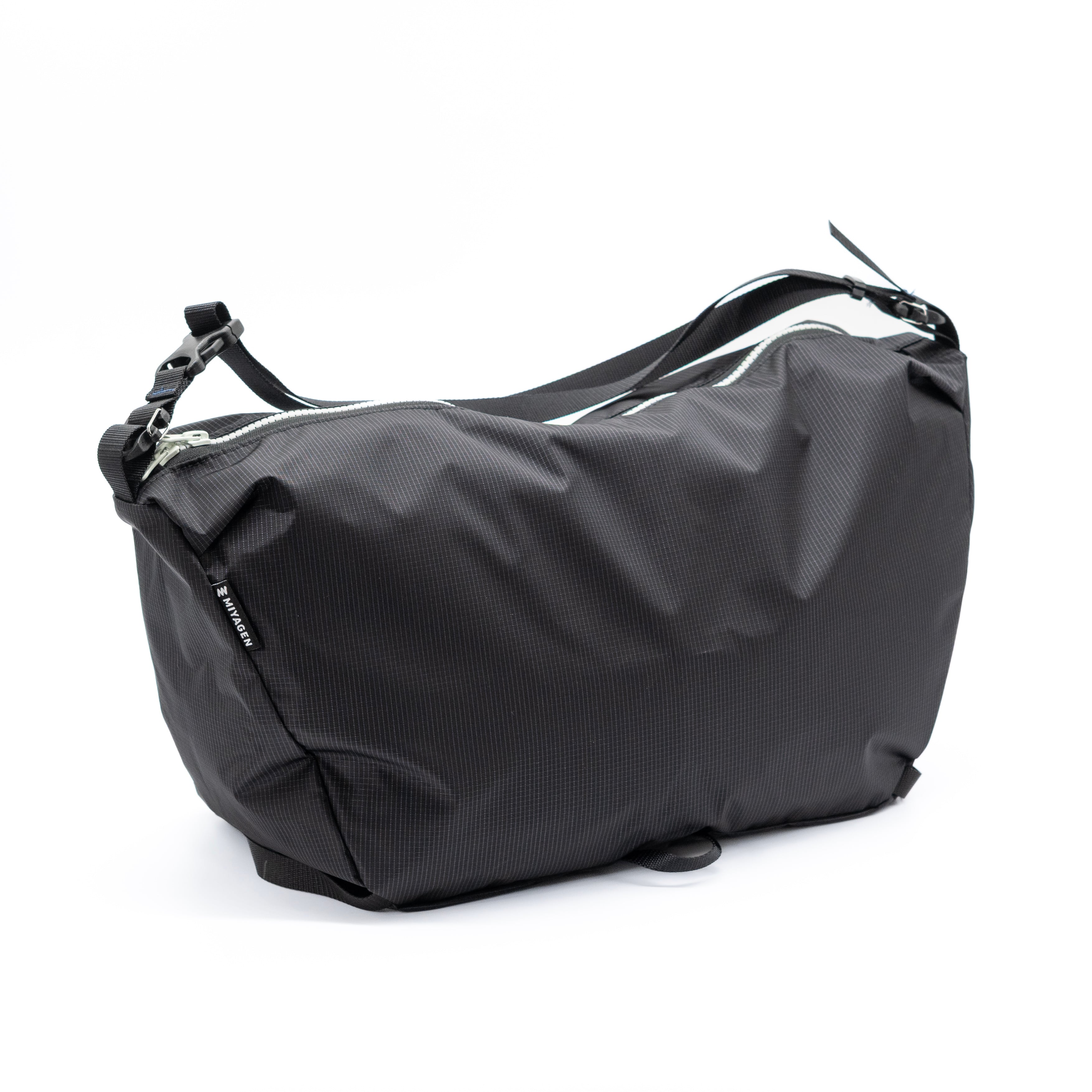 パターンを一から見直し、身体に沿う立体的な"バナナ形状"へ改良。従来の平面的なスタッフバッグより荷重が偏りにくく、サブバッグやショッピングバッグとして持ち歩いてもフィット感と収納力のあるシンプルな道具にしました。